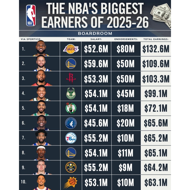 LeBron James, Stephen Curry, and Kevin Durant have built Hall of Fame careers on the court and massive empires off it. Their combined career earnings are projected to reach $3.7 billion by season’s end, according to Sportico. Curry and Durant are set to join Bron as the only active NBA players to surpass $1 billion in total earnings, a milestone achieved by just a few athletes globally. This season, LeBron tops the NBA with $132M in total earnings, including $80M from partners like Nike, Richard Mille, Mattel, and Amazon. Curry leads all players in salary at $59M, while KD remains one of the league’s most marketable stars through Nike, Boardroom, and other ventures. *Methodology: Sportico estimated off-court earnings through industry sources, including royalties, media projects, and brand ventures. Figures are pre-tax and exclude unrelated investment income.