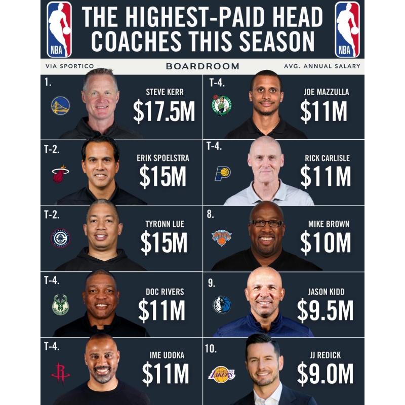 Steve Kerr remains on top. 💰 Franchises now average $5.5 billion in value, yet half the league’s coaches have been in place for under two years. Monty Williams reset the market with a six-year, $78.5 million deal, and nine coaches now make at least $10 million. Even then, coaching pay lags far behind players, with 58 NBA players earning $30 million this season and 170 making $10 million or more.