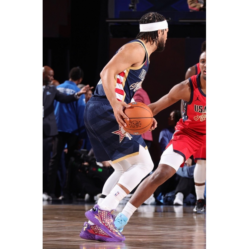 Jalen Brunson from 2026 NBA All-Star Stripes last game against 2026 NBA All-Star Stars played in Nike Kobe 3 Low Protro All-Star Warning Label basketball shoes.