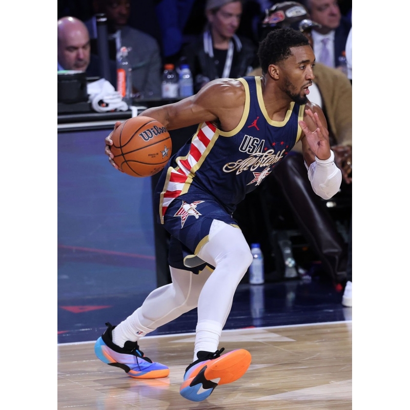 Donovan Mitchell from 2026 NBA All-Star Stripes last game against 2026 NBA All-Star Stars played in adidas D.O.N. Issue 7 All-Star basketball shoes.