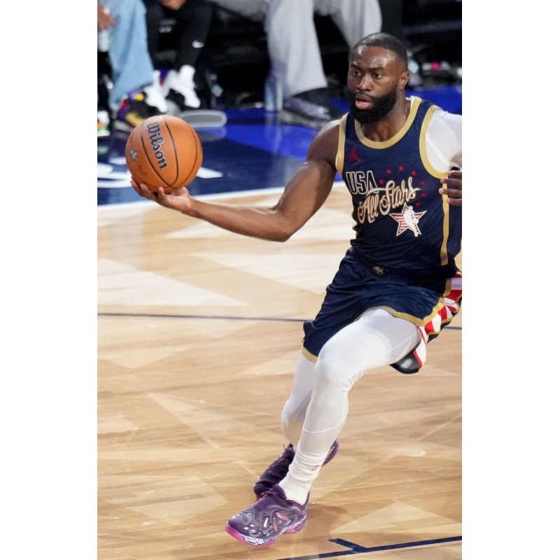 Jaylen Brown from 2026 NBA All-Star Stripes last game against 2026 NBA All-Star Stars played in 741 Performance Rover basketball shoes.
