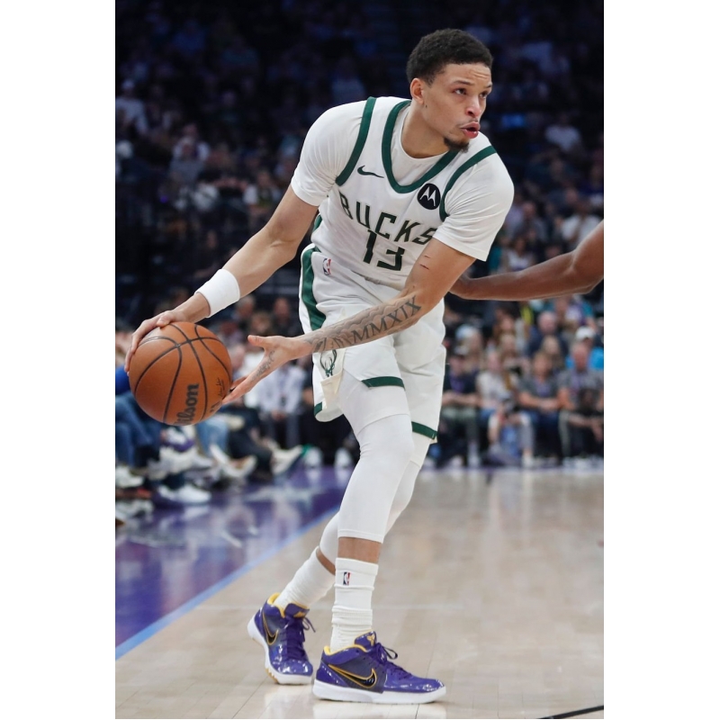 Ryan Rollins from Milwaukee Bucks last game against Utah Jazz played in Nike Kobe 4 Protro Undefeated Los Angeles Lakers basketball shoes.