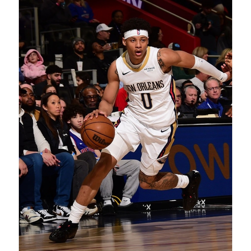 Jeremiah Fears from New Orleans Pelicans last game against Detroit Pistons played in adidas Harden Vol. 10 Hell Cat basketball shoes.
