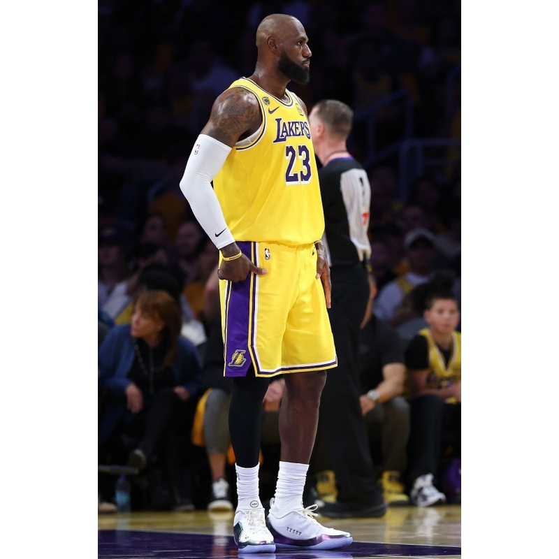 LeBron James from Los Angeles Lakers last game against Houston Rockets played in Nike LeBron 23 Elite For the Record basketball shoes.