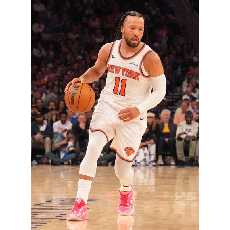 Jalen Brunson from New York Knicks last game against Atlanta Hawks played in Nike Kobe 5 Pink Hearts PE basketball shoes.