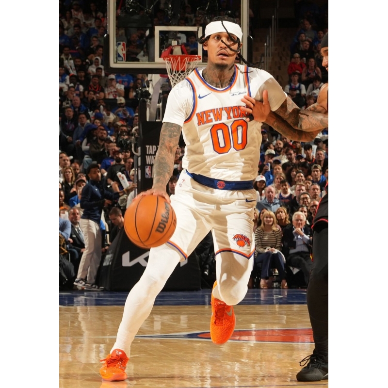 Jordan Clarkson from New York Knicks last game against Atlanta Hawks played in Nike Kobe 6 Protro Total Orange basketball shoes.