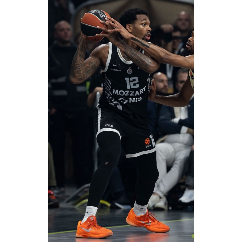 Sterling Brown from Belgrade Partizan last game against FC Barcelona played in Nike Kobe 6 Protro Total Orange basketball shoes.
