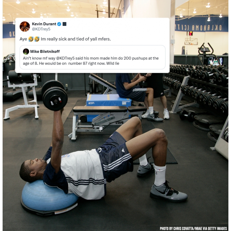 Even Kevin Durant had to laugh at this response to KD saying his Mom made him do 200 push-ups at the age of 8 🤣 KD on his NBA Draft Combine experience: “I remember it like it was yesterday. All the strength coaches were laughing at me and shit. They were giggling with each other that I couldn’t lift 185 pounds, and I was like, ‘All right, keep laughing. Keep laughing.’ It was a funny thing, because I was the only one that couldn’t lift it and I was struggling to lift it. I was embarrassed at that point, but I’m like, ‘Give me a basketball, please. Give me a ball.'”
