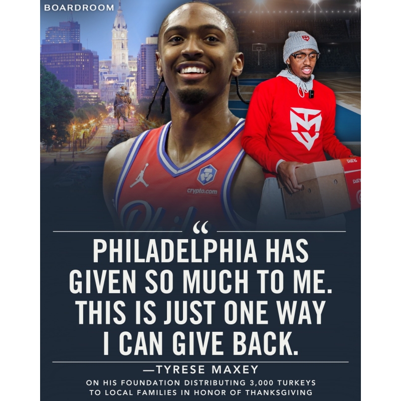 Tyrese Maxey and his Tyrese Maxey Foundation hosted their fourth annual Holiday Turkey Giveaway in Philadelphia, handing out 3,000 full Thanksgiving meals to local families. It’s the largest year yet for the event, up from 2,000 meals in 2024. Families lined up at the Alan Horwitz “Sixth Man” Center for turkeys, sides, fresh produce, and desserts. “These families deserve to have a full Thanksgiving meal and I am glad my Foundation and I can help,” said the Philadelphia 76ers Point Guard. Founded in 2021, the Tyrese Maxey Foundation focuses on developing the next generation of leaders through family, faith, and community-driven programs.