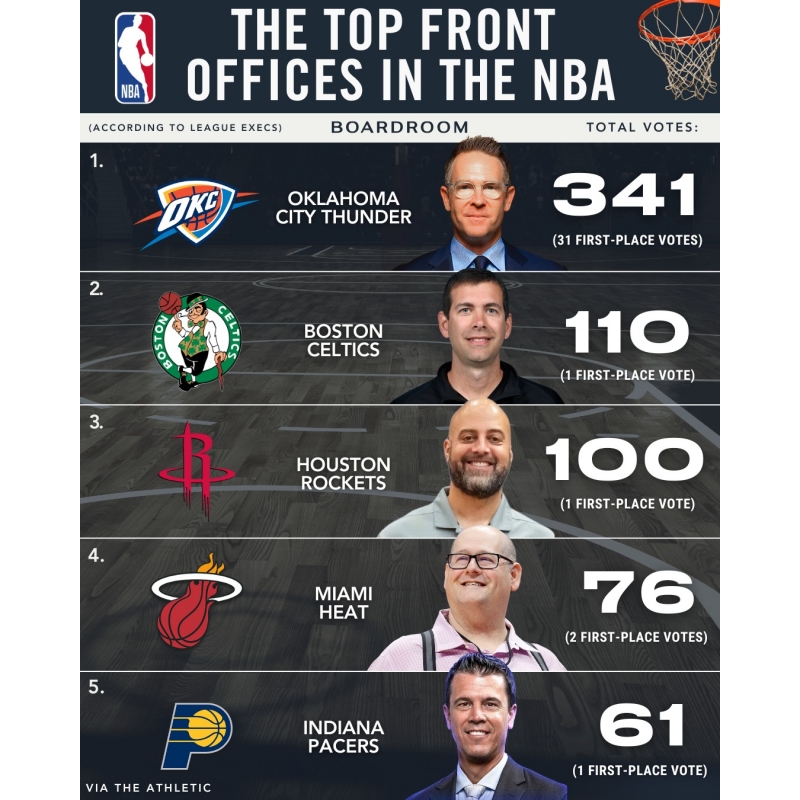 The NBA’s top front office belongs to Oklahoma City. Execs across the league voted Sam Presti and the Oklahoma City Thunder No. 1 again, rewarding a group that just delivered 68 wins, a title run and still holds one of the deepest draft-asset stashes in the league. OKC is the rare contender that wins now and builds next—landing SGA and Jalen Williams, hitting late picks, finding Lu Dort, and hiring Mark Daigneault. Everyone else is chasing the standard they’ve set.