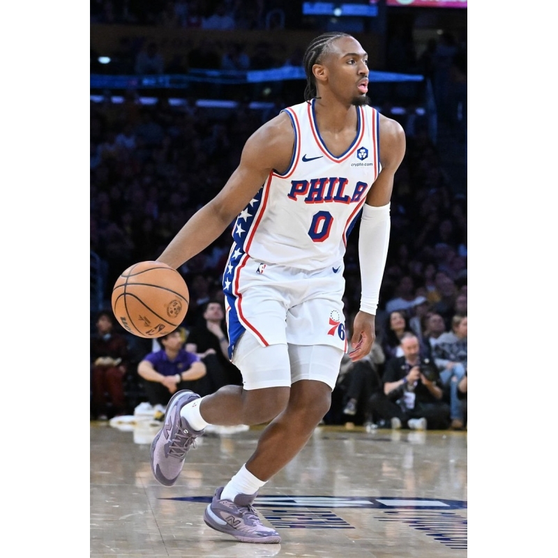 Tyrese Maxey from Philadelphia 76ers last game against Los Angeles Lakers played in New Balance Hesi Low v2 basketball shoes.