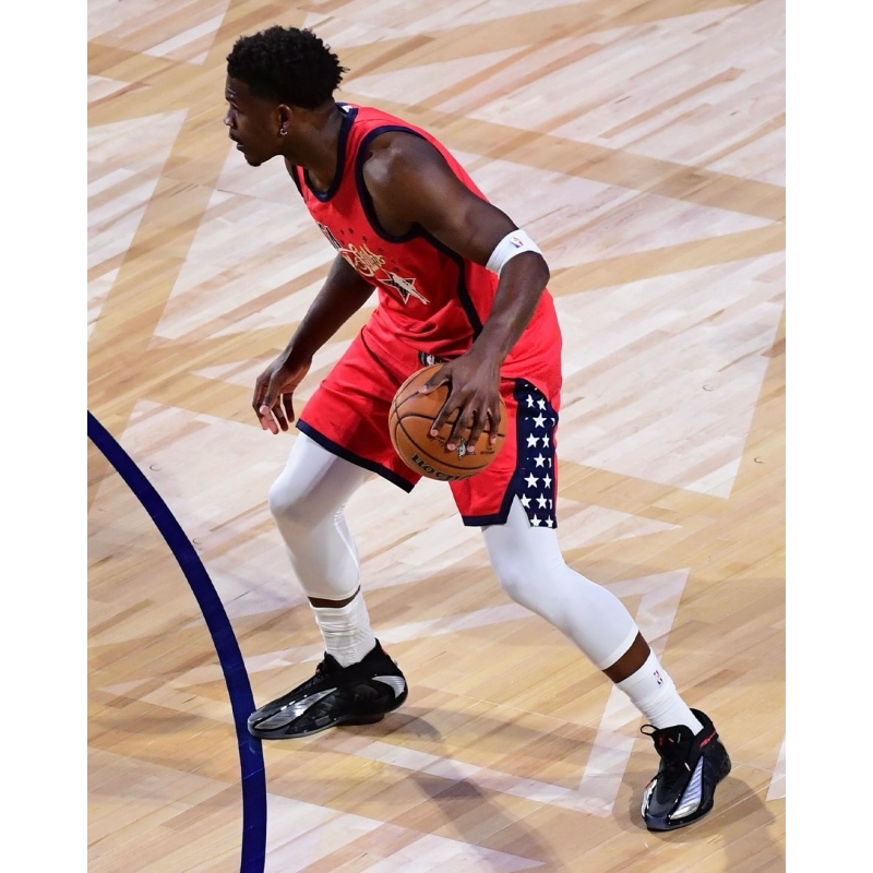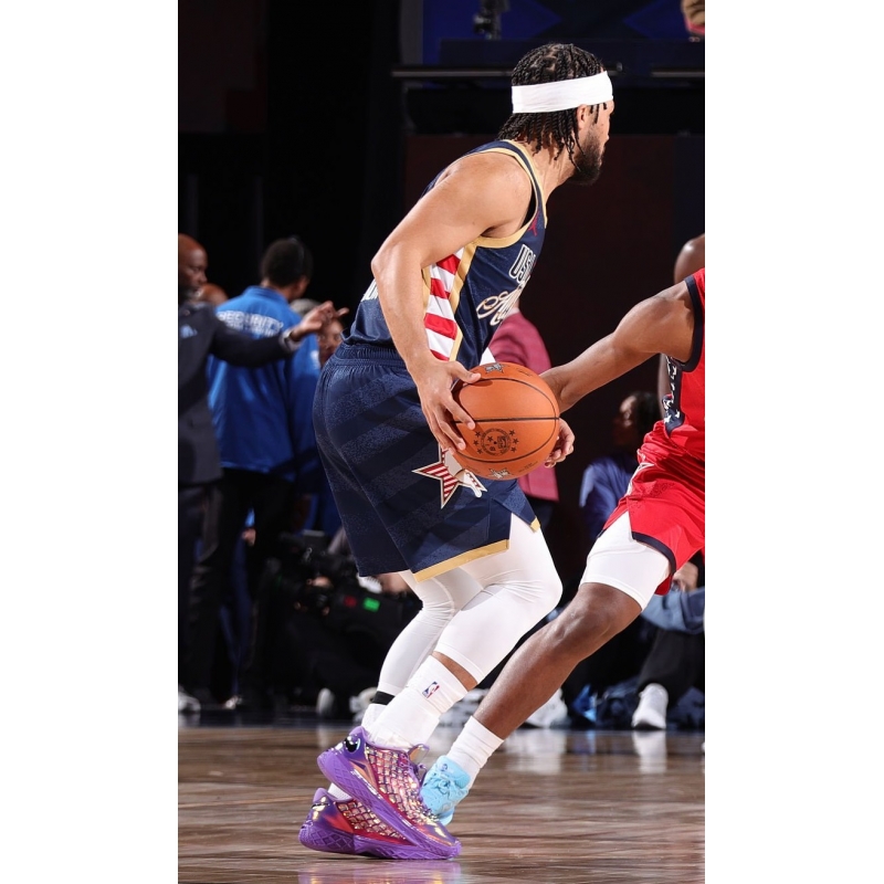 Jalen Brunson from 2026 NBA All-Star Stripes last game against 2026 NBA All-Star Stars played in Nike Kobe 3 Low Protro All-Star Warning Label basketball shoes.