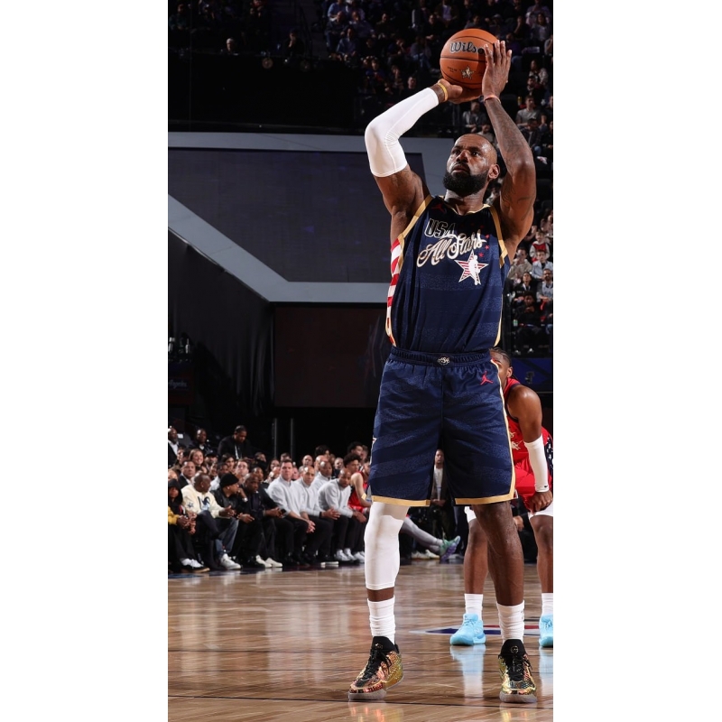LeBron James from 2026 NBA All-Star Stripes last game against 2026 NBA All-Star Stars played in Nike LeBron 23 All-Star Warning Label basketball shoes.
