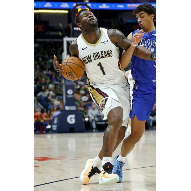 Zion Williamson from New Orleans Pelicans last game against Dallas Mavericks played in Jordan Zion 4 basketball shoes.