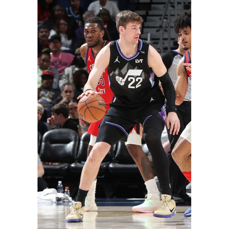 Kyle Filipowski from Utah Jazz last game against New Orleans Pelicans played in Nike Kobe 4 Protro x F.C. Barcelona basketball shoes.