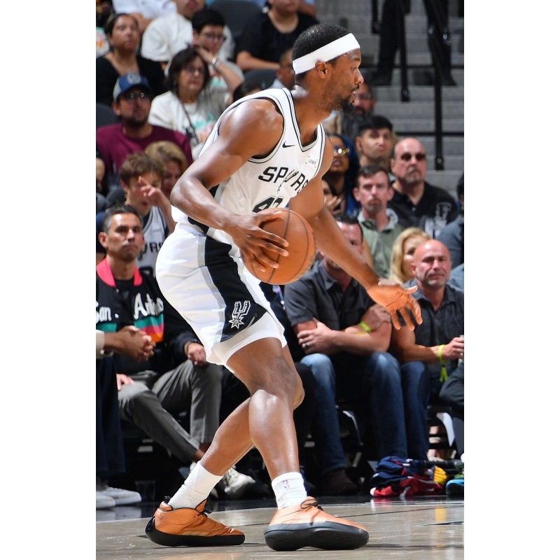 Harrison Barnes from San Antonio Spurs last game against Denver Nuggets played in Jordan 40 SL Metallic Copper basketball shoes.