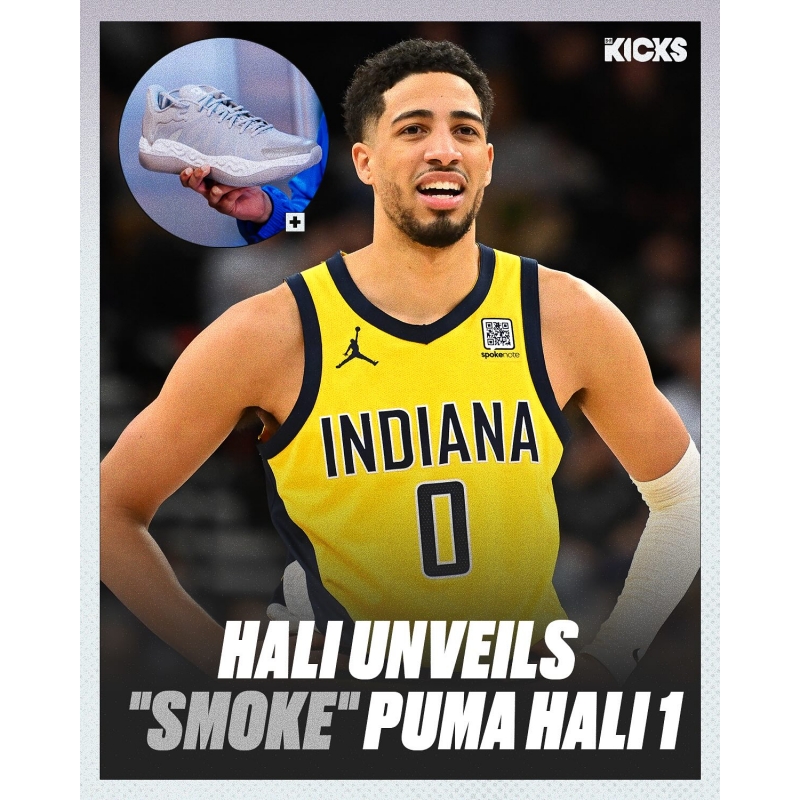 PUMA gives us an official look at Tyrese Haliburton’s signature logo on its new “Overrate THAT” t-shirt dropping on June 4 👀🔥 Hali’s logo was first teased on the heel of an yet-to-be-seen PUMA shoe and then debuted on a custom jacket he wore arriving to Game 3 of the Eastern Conference Finals. Are you ready for a Haliburton signature shoe? 🤔
