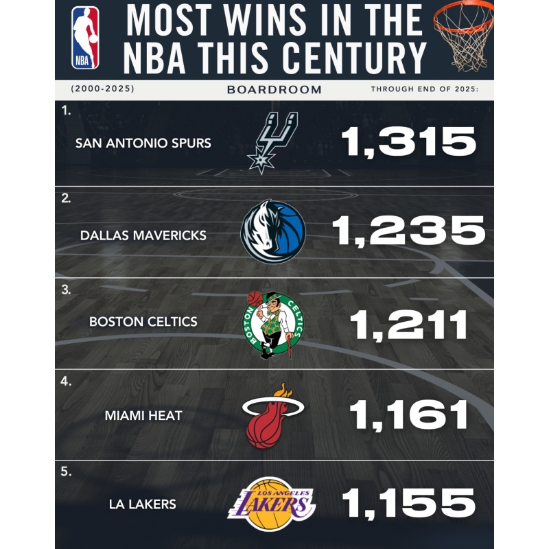 Since the start of this century, the San Antonio Spurs have posted more wins and a higher winning percentage than any franchise in the NBA, quietly setting the league’s standard for sustained excellence. Under Hall of Fame coach Gregg Popovich, and powered by a roster stacked with Hall of Famers and future inductees, San Antonio captured four NBA championships, winning every Finals appearance but one. The run defined an era built on consistency, culture, and execution.